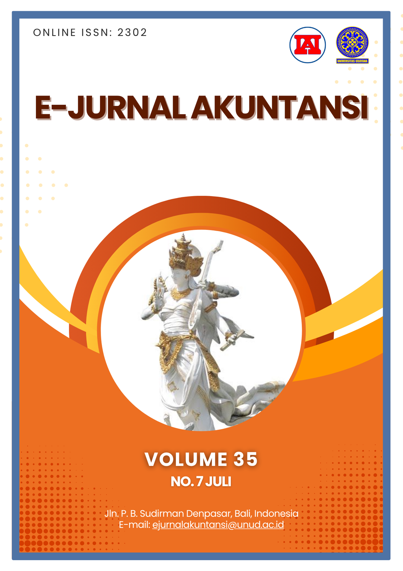 E-Jurnal Akuntansi [e-ISSN 2302-8556] is an electronic scientific journal published online once a month. The Scientific E-Journal of Accounting (EJA) is published by the Accounting by the Accounting Department of Economic and Business Faculty in Universitas Udayana in collaboration with the Institute of Indonesia Chartered Accountants, Bali Region and The Indonesian Institute of Accountant-KAPD. E-Jurnal Akuntansi is accredited in SINTA (Science and Technology Index) by the Ministry of Research and Technology of Republic of Indonesia, GRADE 5 (SINTA5) Decree No.30/E/KPT/2018 valid from Volume 23 Nomor 1 (2018) to Volume 34 Nomor 3 (2022) and re-accreditation to GRADE 3 (SINTA3) Decree No.79/E/KPT/2023 valid from Volume 32 Nomor 1 (2022) to Volume 36 Nomor 2 (2026). -