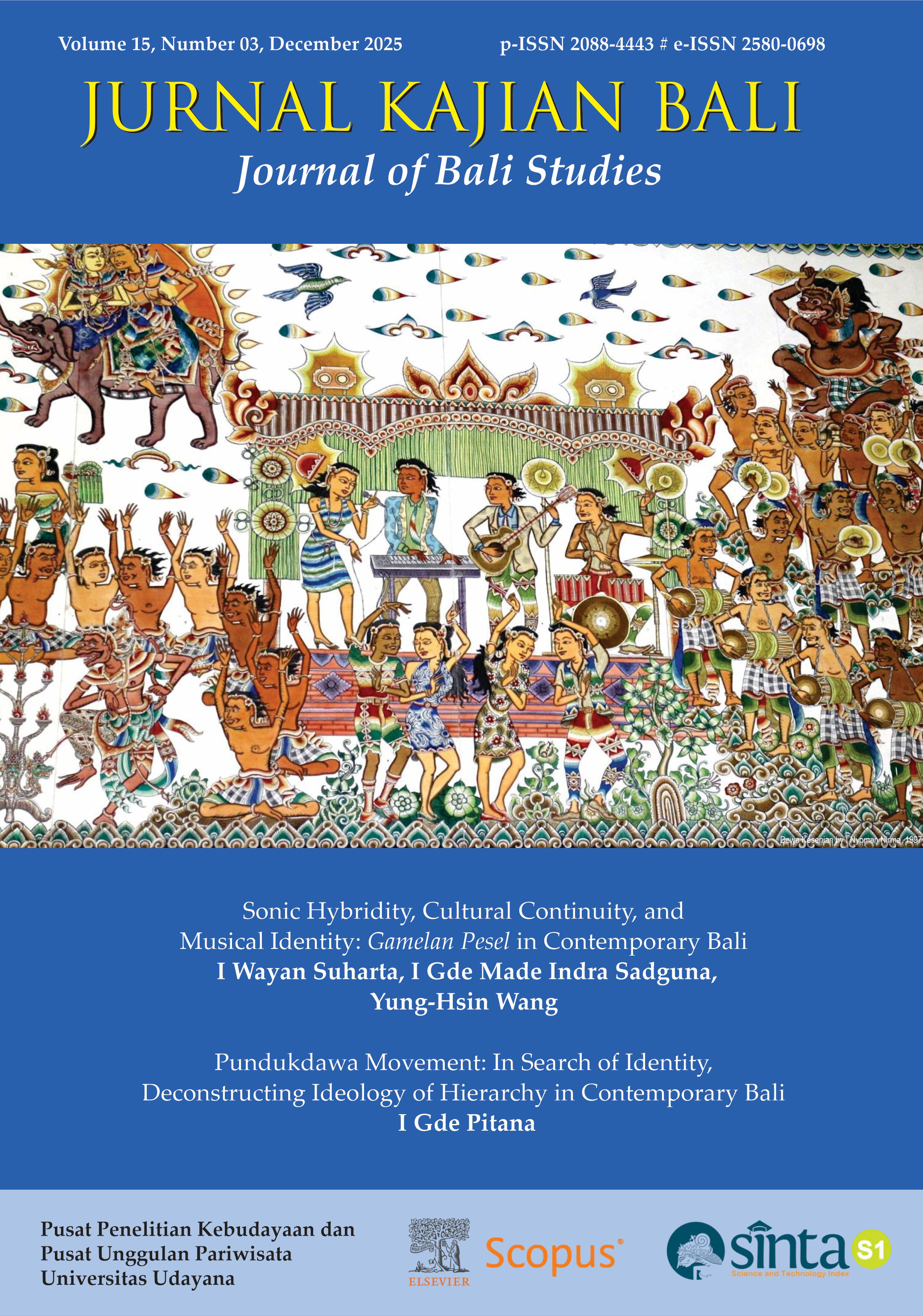 Yudarta, I. G., Sutjiati Beratha, N. L., & Sudirga, I. K. (2025). Actualization of the Spirit of Nationhood in Karawitan Musical Compositions by Balinese Maestro I Wayan Beratha. Jurnal Kajian Bali (Journal of Bali Studies), 15(1), 314–344. https://doi.org/https://doi.org/10.24843/JKB.2025.v15.i01.p12